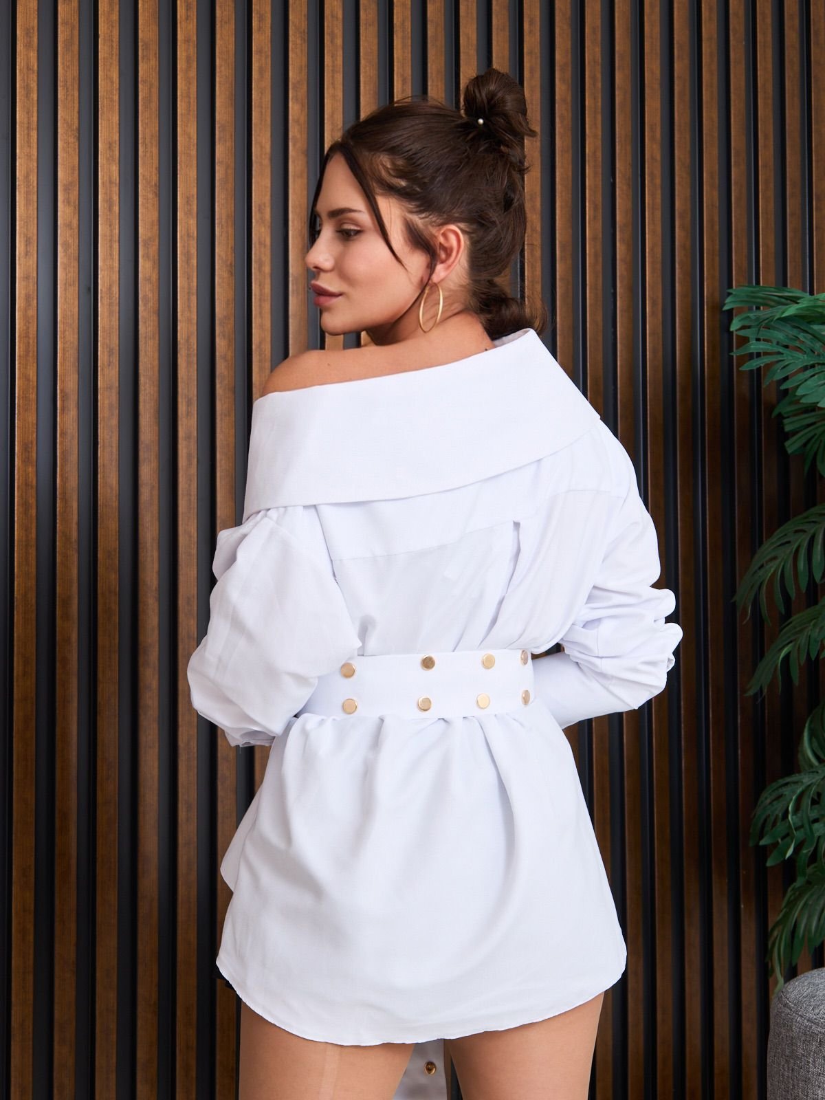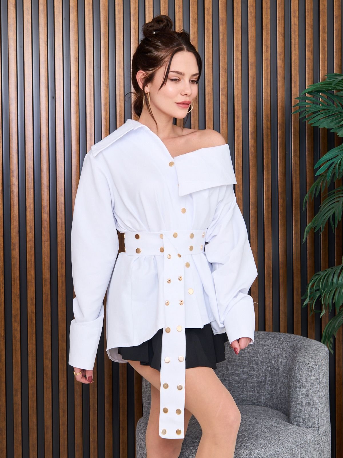 Düğme ve Kemer Detay Asimetrik Yaka Gömlek